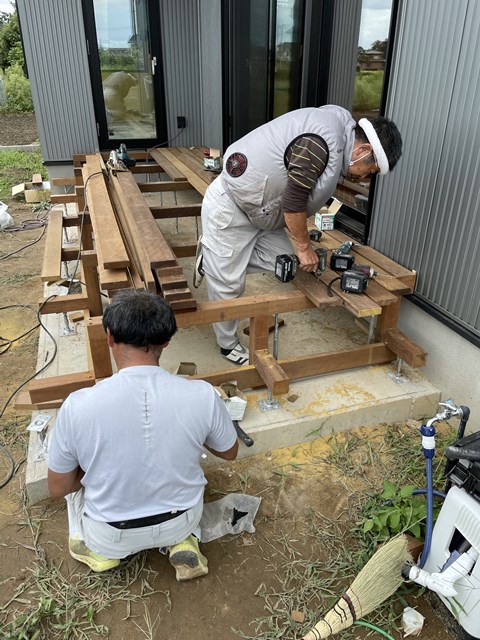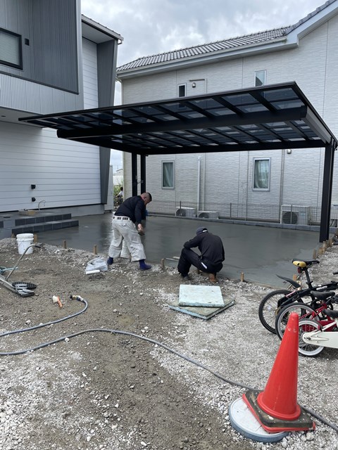 T様邸は今日、カーポート部の生コン打設とデッキ工事をやっているのでちょい顔出しー☝