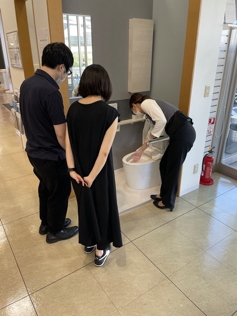 浴槽はW様のように、皆さんぜひ入って確認しましょうね。広さや頭をのせてくつろいだ感じのフィット感