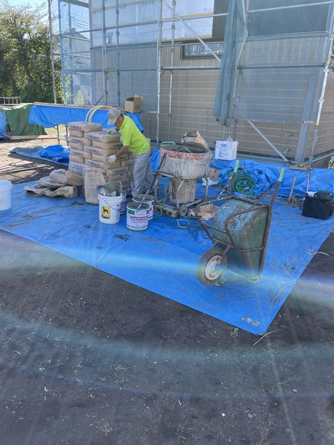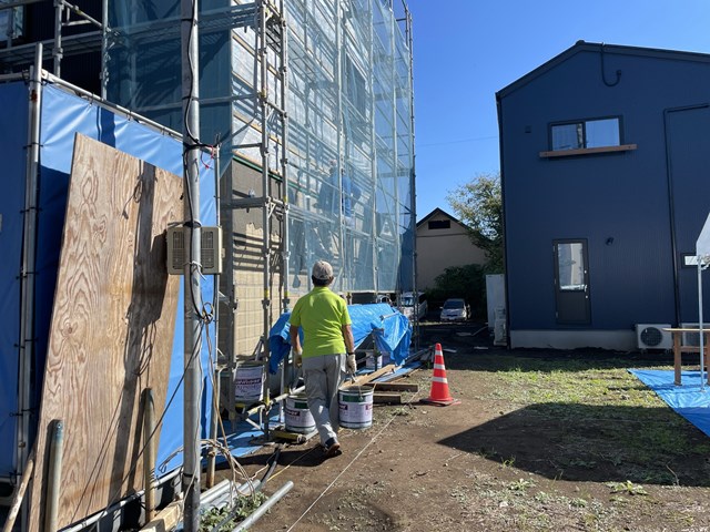 D様邸では、左官Aさんパパがネリネりしてますぅ~。足場解体も近いですわね。