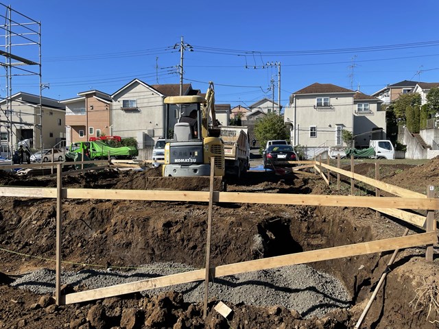 N様邸は深基礎部分に砕石入れ始めましたねー。土の搬出だけでも結構日数かかったな。