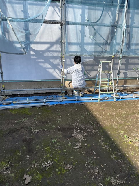 左官Aさんが仕上げ材を塗るのに、シーラー(ノリみたいなものです)をローラーでヌリヌリしてます。