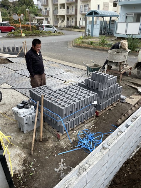 ワタクシと外構Tさんで、えっ?!なになに??ブロック積み職人の血が騒いじゃうのぅ😻って