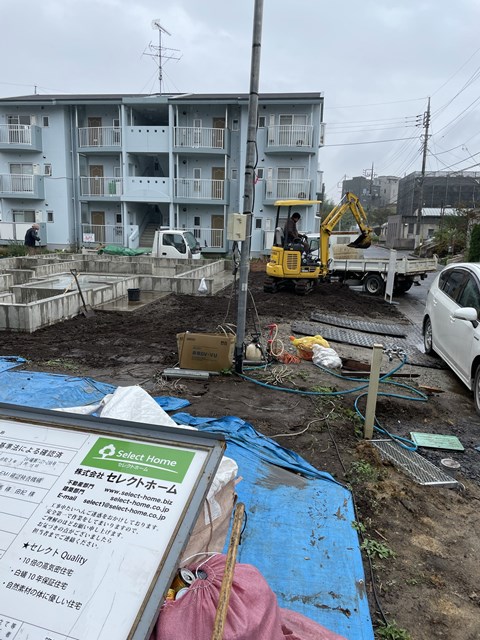 お隣では雨降りちゃんなのに、基礎屋さん地均ししてるわ。