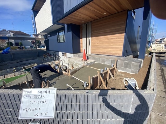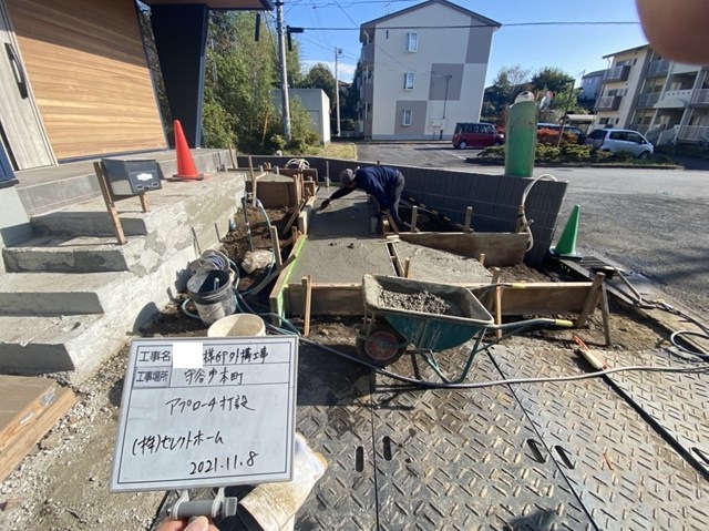 S様邸のアプローチスロープ下地モルタル工事。