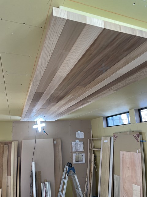 この間のマホガニー材、下塗りされてて少しずつ色が変わって行ってますねー。