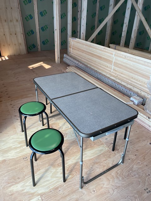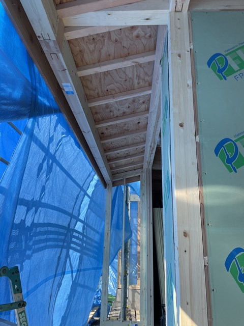 T様ご到着前に下屋の仕上げ方について大工Oさんと打ち合わせ!