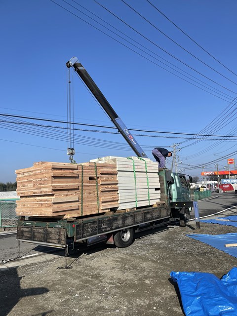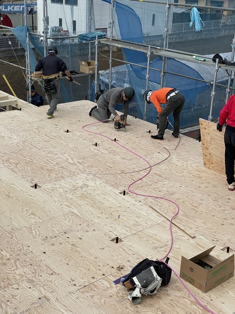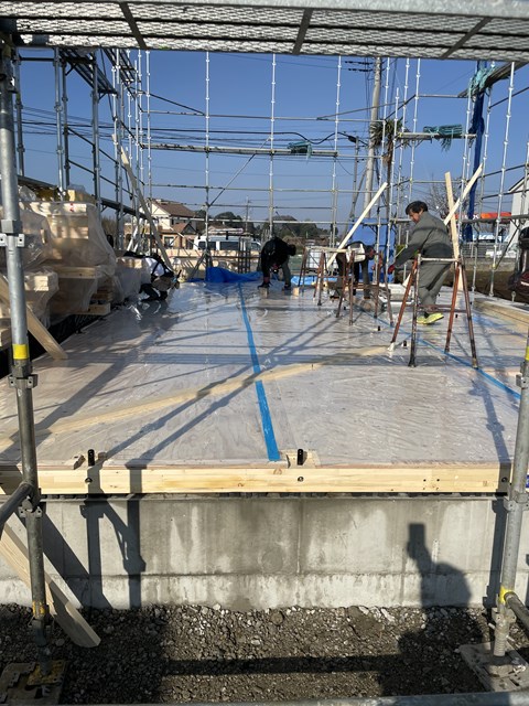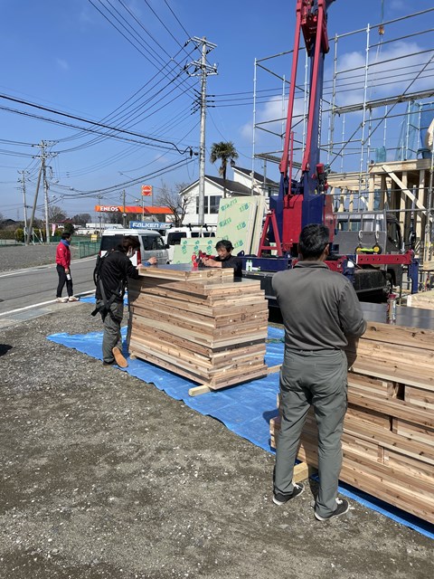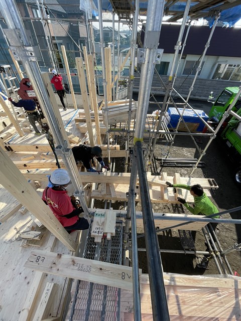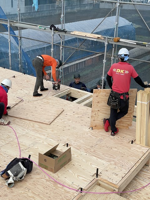 2Fの床が張り終わると、ウチはルールで決めているので協力会社の鳶さんが率先して