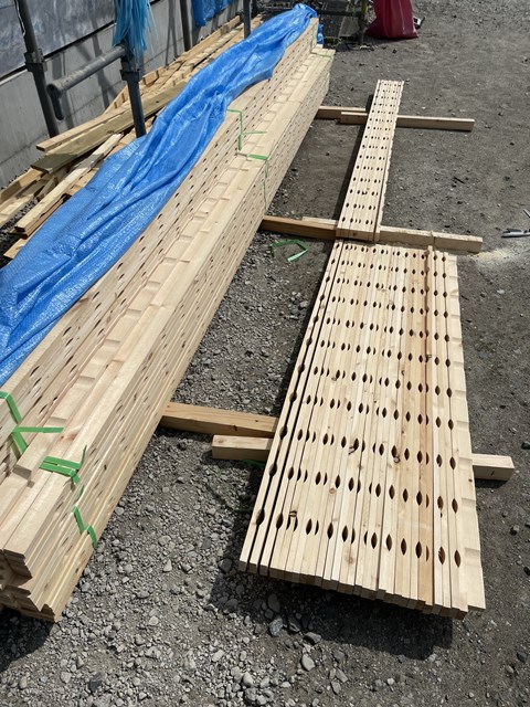 こちらは、エアホールタイプの通気胴縁です。通気胴縁も赤松を使うというこだわりポイントだったりしてー😆