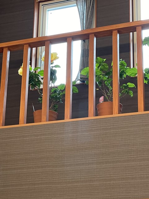 格子越しですが、ハイビスカスちゃんがもう咲いてます✨