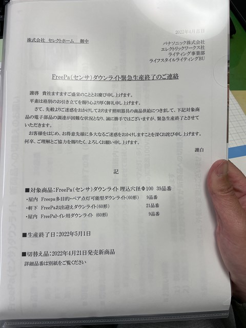 センサーダウンライトの緊急生産終了ですって。