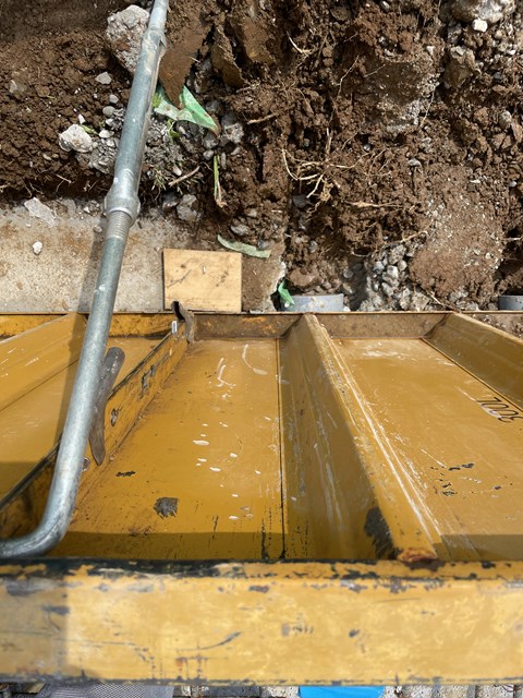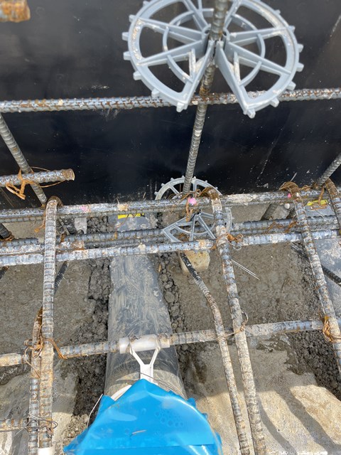 ちょっとわかり難い写真ですが、捨てコン斫って配管と鉄筋の空き寸法を取るやり方なんですけどね