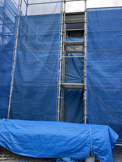 今日天気が荒れる予報が出ていたので下地モルタルに被害が出ないようにしっかり養生する完璧な仕事をしてくださいます👍