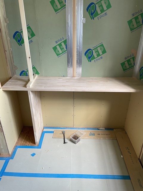 造作洗面カウンターは全く難しい事は無いのですが、3面鏡隣の空きスペースにワタクシが造作収納の絵を書いているので