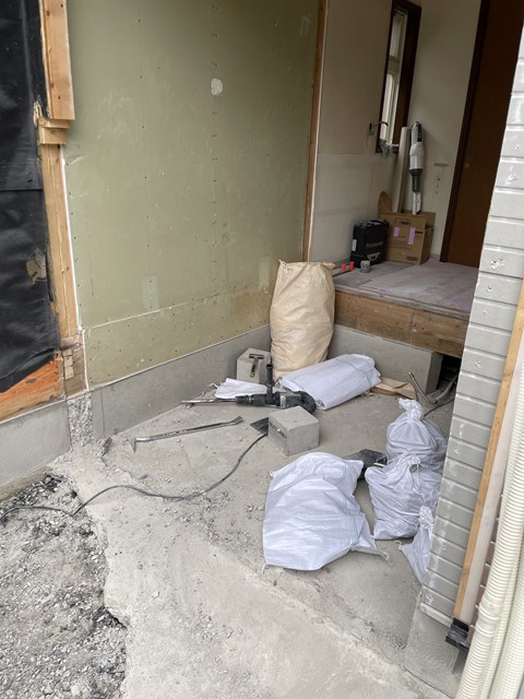 着々と解体作業が進んでますねぇ~。基礎立ち上がりの斫も終わり、後はスラブと犬走部分のコンクリートを斫ったら