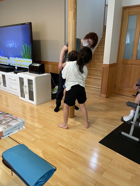 ウチの化粧柱でどれだけ足を付けずに我慢できるか遊んでます((´∀`))ケラケラ