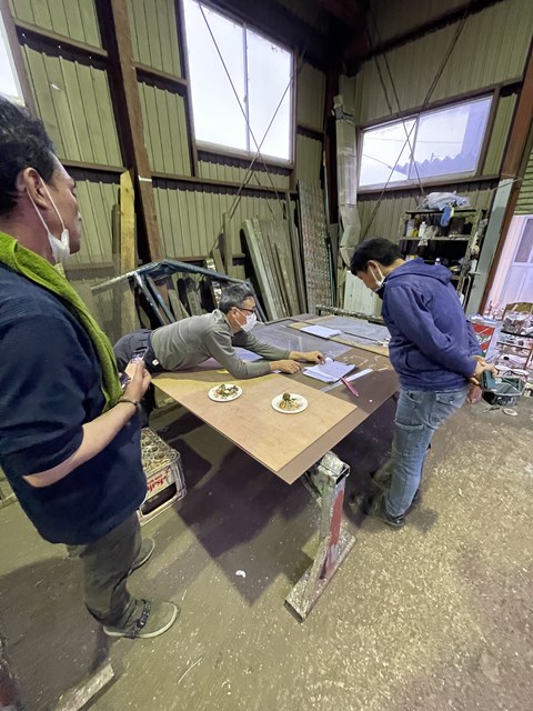 Yさんの家族がタコパ―中という事もありたこ焼きをつまみながら、守谷市S様邸の最終鉄骨手摺の打ち合わせ~。