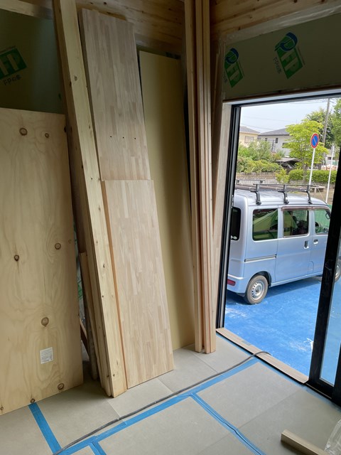 ココに立てかけている造作材が、ワタクシが絵を書いて寸法も指示したサイズより3cm短くプレカットされていると。。。