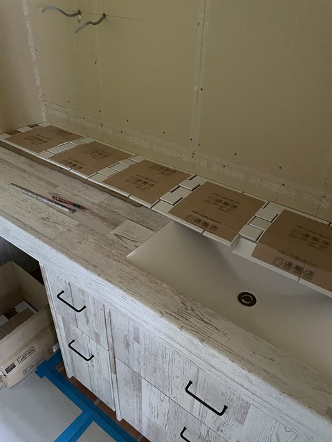 洗面に採用したタイルを並べて、切り物をどっち側に入れるかを確認☝