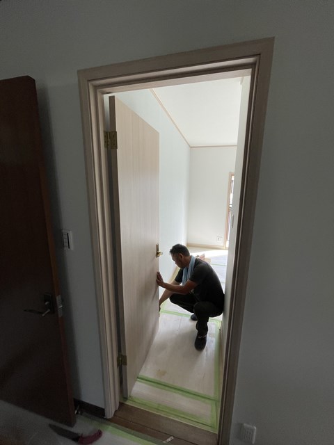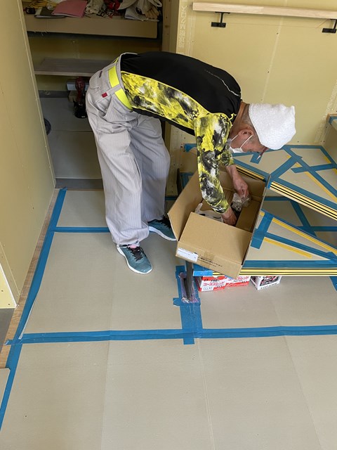 ご主人が、奥様が好んでるフロアタイルを当ててる写真なんですが