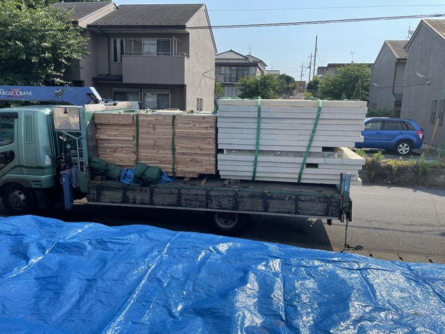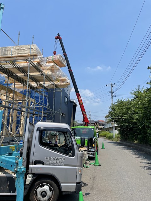 休憩後はいつも通り、ユニックちゃんで2F床合板を荷下ろししますぅ~。