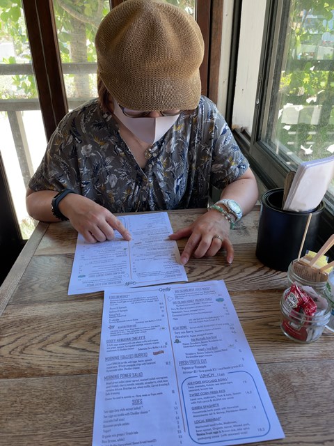 怪しい女性が、小説を読んでいるかのようにメニューに集中!