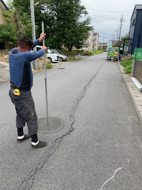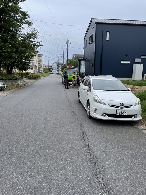 当時のBM(ベンチマーク)が道路のマスという事でFさんが構えたんだけどー。