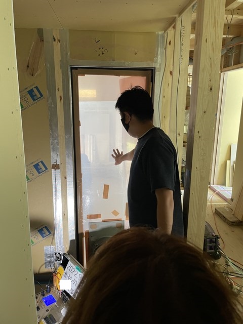 測定士Kさん、スタンバイOK👍ガレージへ繋がるテラスドアが検査場所って、、、