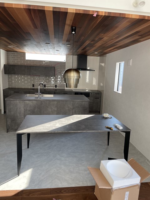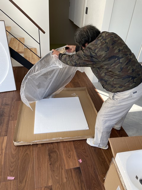 何しに来たかと言いますとぉ~、ダイニングに設置する特大鏡を設置しに