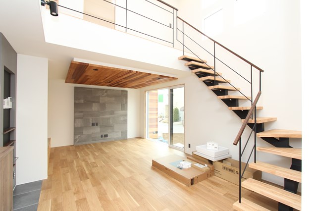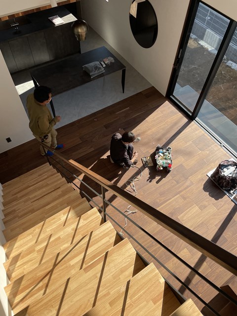 今日のお題は吹抜け隣接部の手摺と床材、見切り材の納めについて。