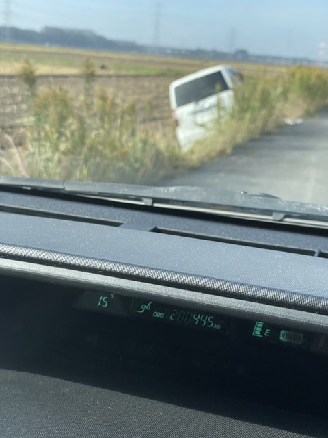 ダーイブ!!農道で多々見る光景です。不思議なのが運転席がに対向車とぶつかった後があるんだけど