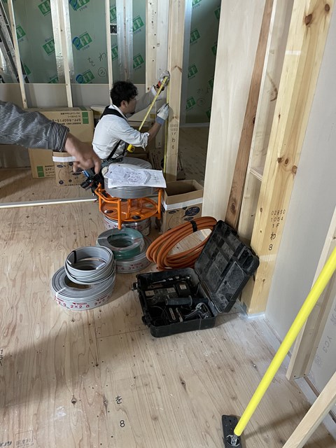 キッチンバックセット上に設置するコンセントもY様からこだわりを伺い、電気Oさんがその場で高さを出してます🤭