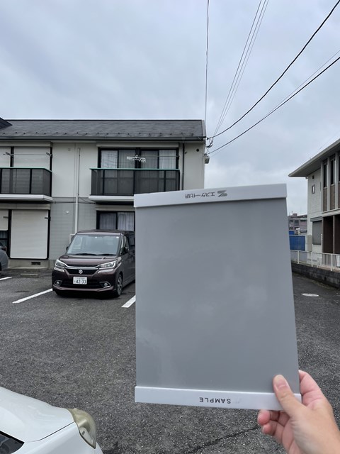 ワタクシのお勧めは一番濃いグレーをベースにシャッターと雨樋を黒でメリハリ付けてちょっと目立つようにがお勧めですーってプレゼンしたら