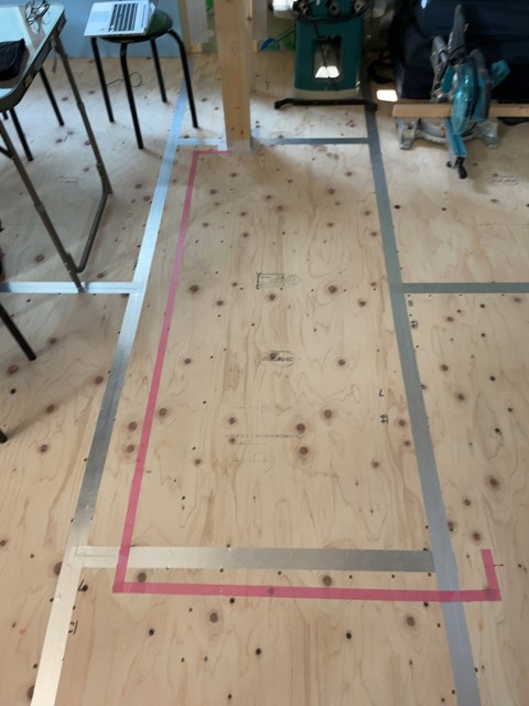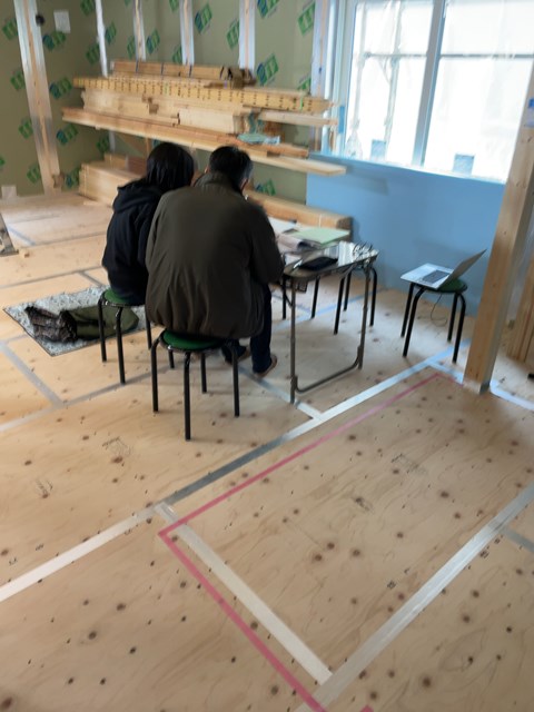 S様邸もカントクぅ~がマスキングテープでキッチン配置を墨出してるわ。