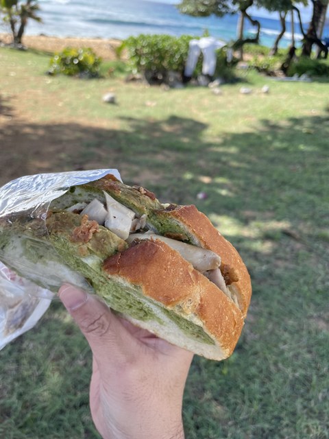 行きの飛行機でもらったパンにフリフリchickenをサンド!