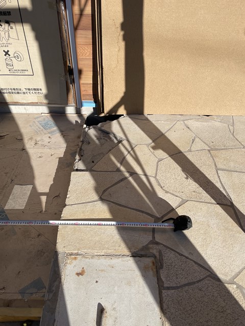 新しくつくる玄関ポーチをどこまで広げるかをカントクゥ~と寸法確認と