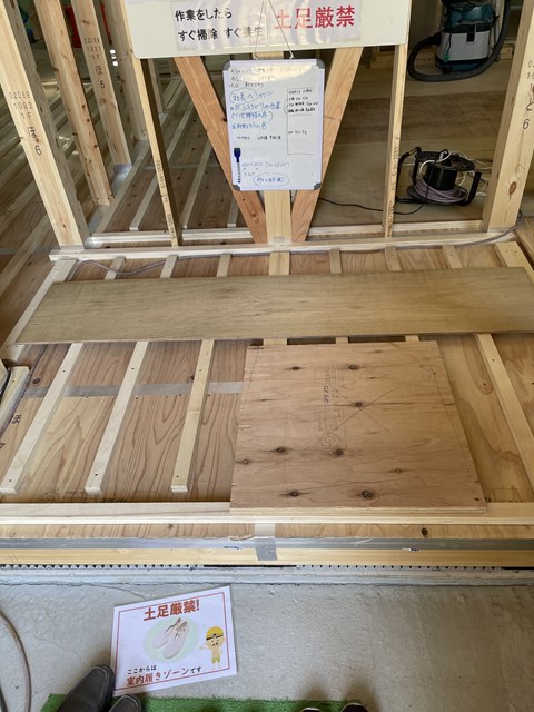 床暖の下地作業が始まったので、歩き難くなるところを