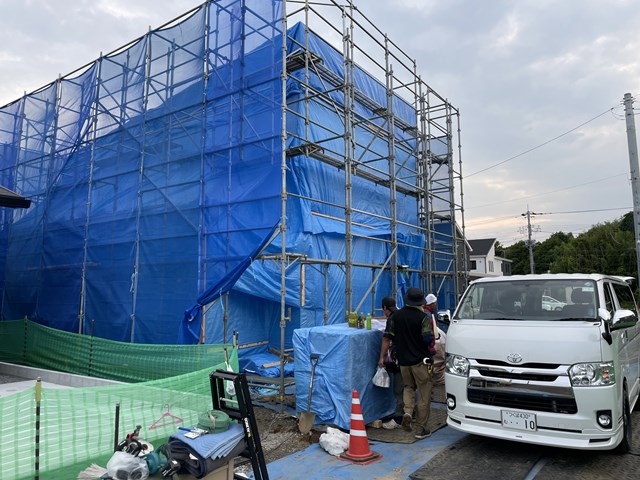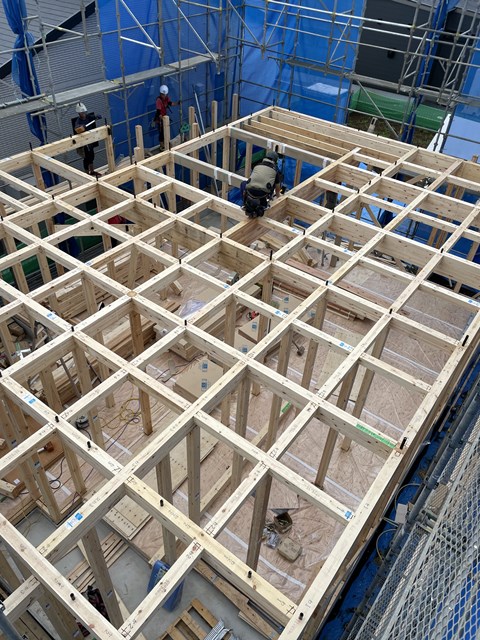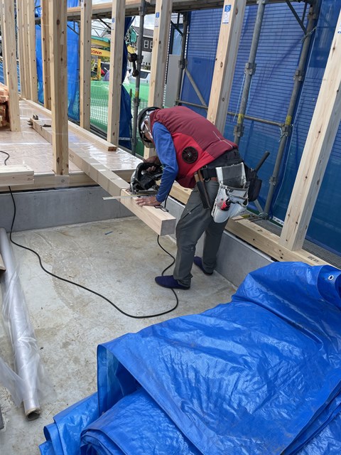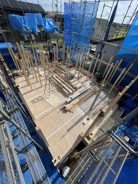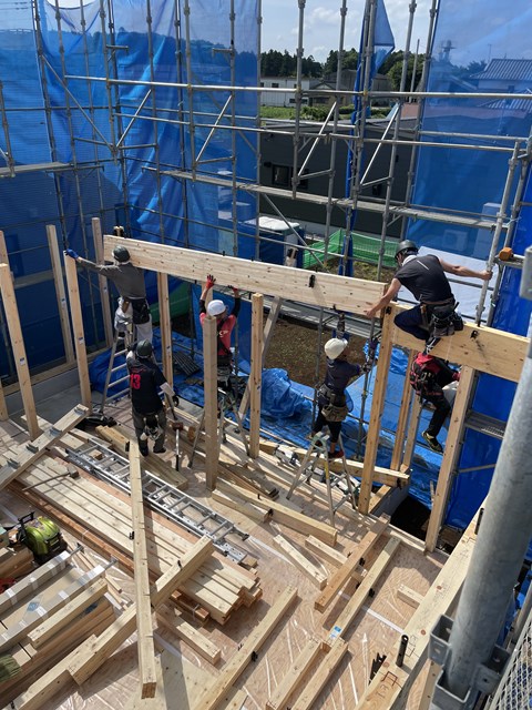 O様邸、1Fが大きくレッカーが届かなくて一番大きい梁を人力ではめてます💦