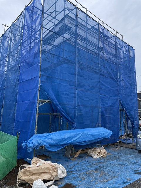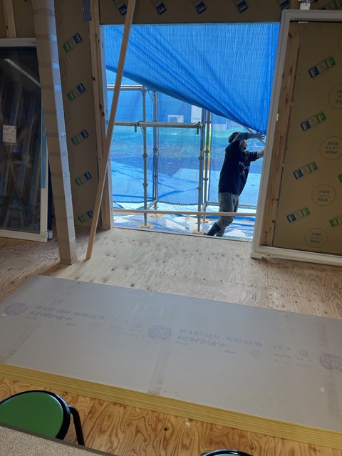 雨養生でブルちゃん巻きになってて風が抜けないのを、大工Y君が風抜けるようにしますね!って率先して動いてくれます。