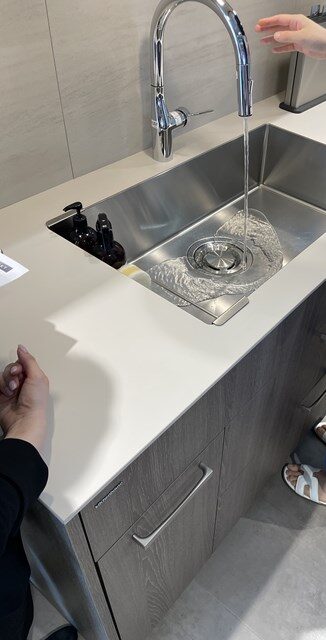 採用を検討しているKVKのタッチレス水栓の実演。