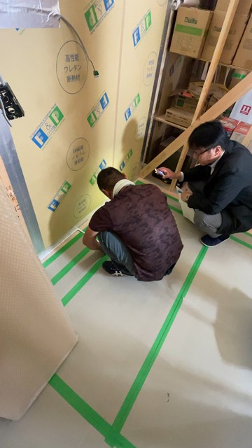 大工Yさんがコンベックスで測ってると、すぐにケータイライトを向けるM所長気が利きます👍