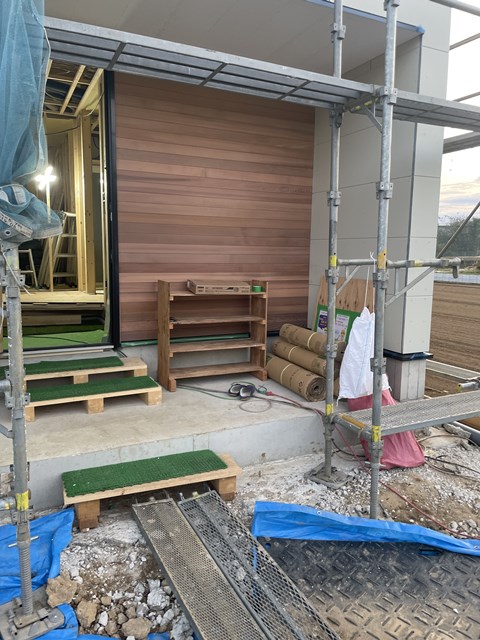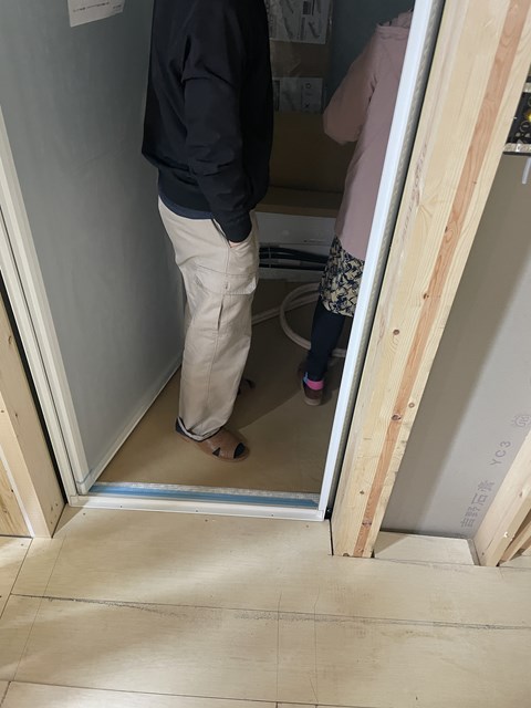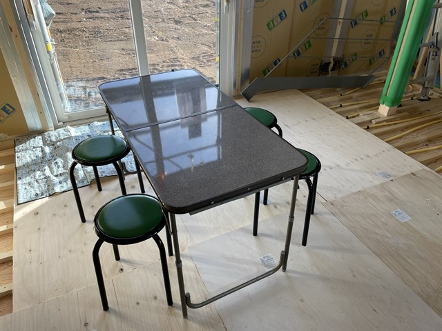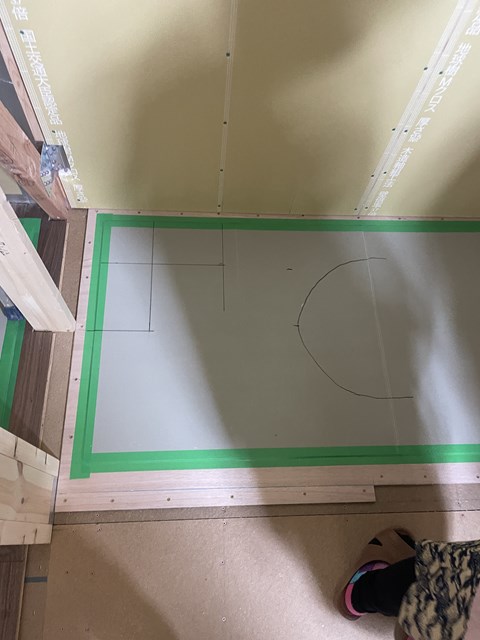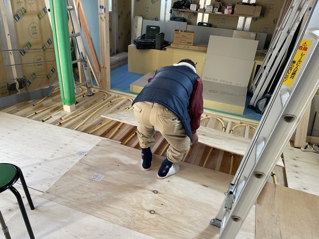 大工Kさんが、床暖で足元悪いからベニヤを敷いてくれてますぅ~。