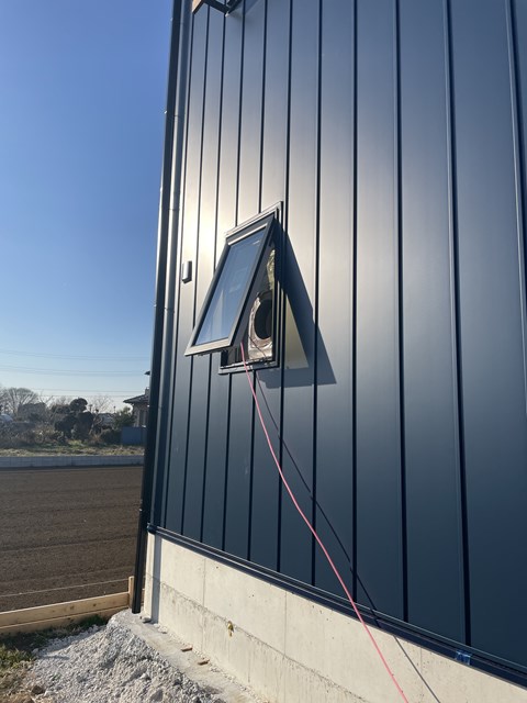 この1か所だけ窓を開けて、気密測定器のファンで家の中の空気を外に排出して