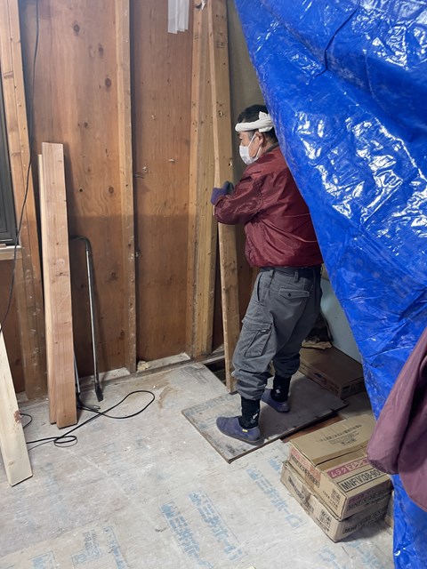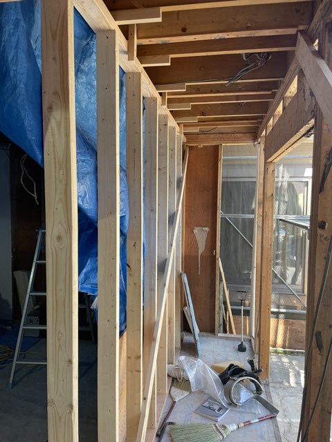 2×4の場合、傷んでるところを直すのに、こうやってサポートを組みながら施工していかないと