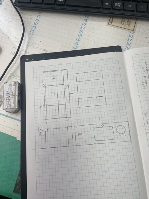活動開始する前に、夜中に今日打ち合わせのつくばみらい市 A様邸の造作洗面の絵が途中までしか