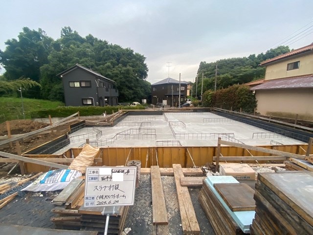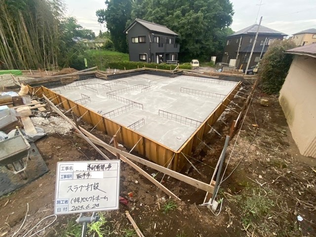 スラブ打設すると、基礎Fさんの芸術的な細かーい配筋は見えなくなっちゃいますね(笑)