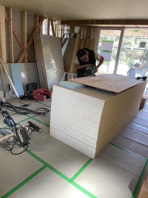 大工Yさんがカットしている木くずが舞、チョイむせーーー☝