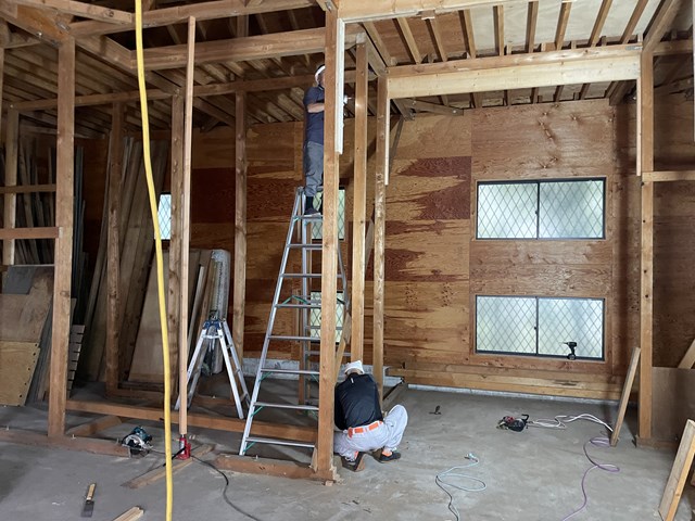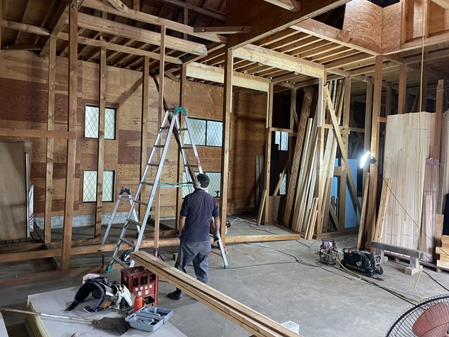 倉庫内でユニックちゃんのブームをぶん回せるように、梁を抜いたり補強したりをやってもらっているんです☝