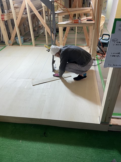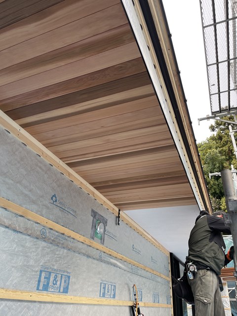 大工Yさんは、K様が塗装してくださったレッドシダーを施工中~
