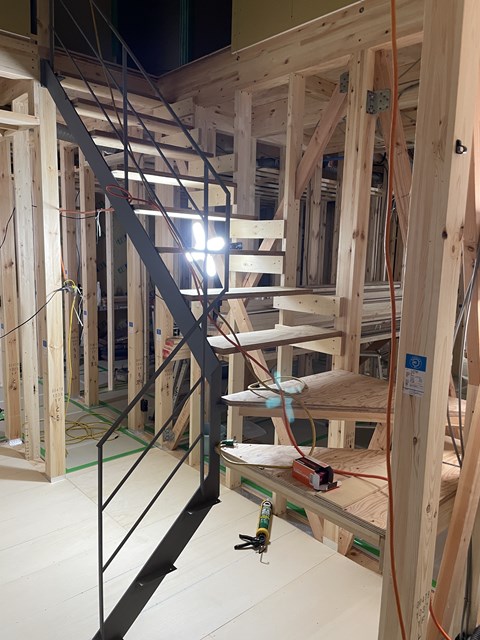 大工Oさんが、鉄骨階段の細かい納まり部分を調整してますね。頑張れ!!おめんめ見えてるか??