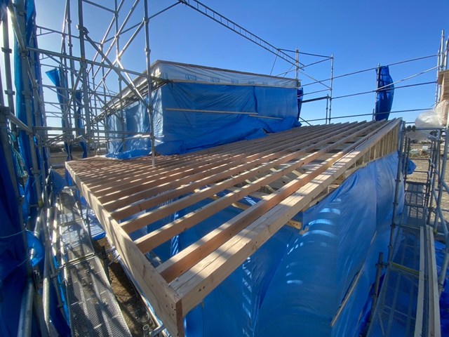 屋根の骨部分垂木を施工したあとは、この野地板というのを施工します。